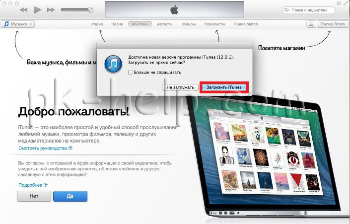 Если у вас установлена старая версия iTunes то первое, что программа предложит сделать- обновиться до последней версии. Нажмите кнопку "Загрузить iTunes" и установите последнюю версию программы.