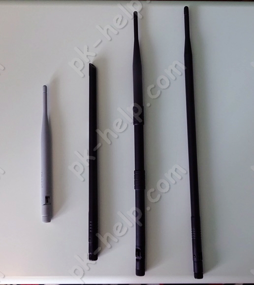 Поскольку нельзя увеличить мощность передатчика, можно пойти другим путем и использовать более мощную антенну с высоким коэффициентом усиления. В большинстве Wi-Fi роутеров используется антенна с коэффициентом 2-3, реже 5 dBi, но можно приобрести более мощные антенны с коэффициентом 10 dBi и более. В данном примере я приобрел три различные всенаправленные антенны с одинаковыми коэффициентами усиления 9-10 dBi (слева штатная Вай Фай антенна).В этой статье я буду тестировать все эти антенны для того, что бы ответить себе и вам на несколько вопросов: