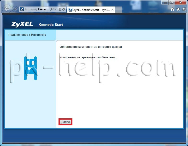 После установки обновлений и перезагрузки роутера (это займет не более 5 мин) у вас появиться окно о том, что Компоненты интернет центра обновлены и можно приступить к следующему шагу, нажимаем "Далее".