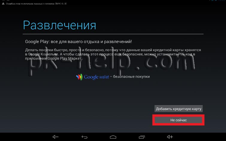Если вы планируете покупать приложения в Google Play, вы можете добавить в свой аккаунт кредитную карту, что бы ею расплачиваться. В данном примере я не буду этого делать. Добавить данные кредитной карты можно в любой момент как только это понадобиться. Нажимаю "Не сейчас".