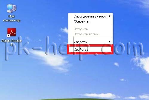 Нажимаем правой кнопкой мыши на пустой области рабочего стола, в контекстном меню выбираем "Свойства".