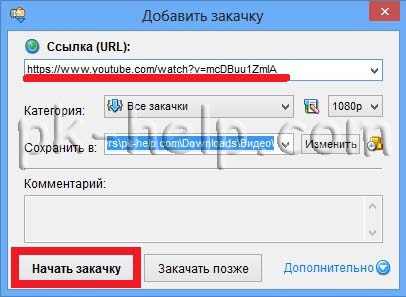В окне "Добавить закачку" вставляете URL необходимого ролика и нажимаете "Начать закачку".